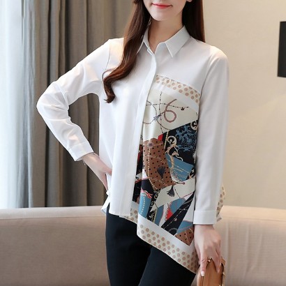 เสื้อเชิ้ตผ้าชีฟองพิมพ์ลายชายไม่เสมอกัน